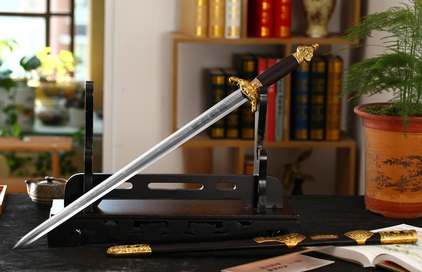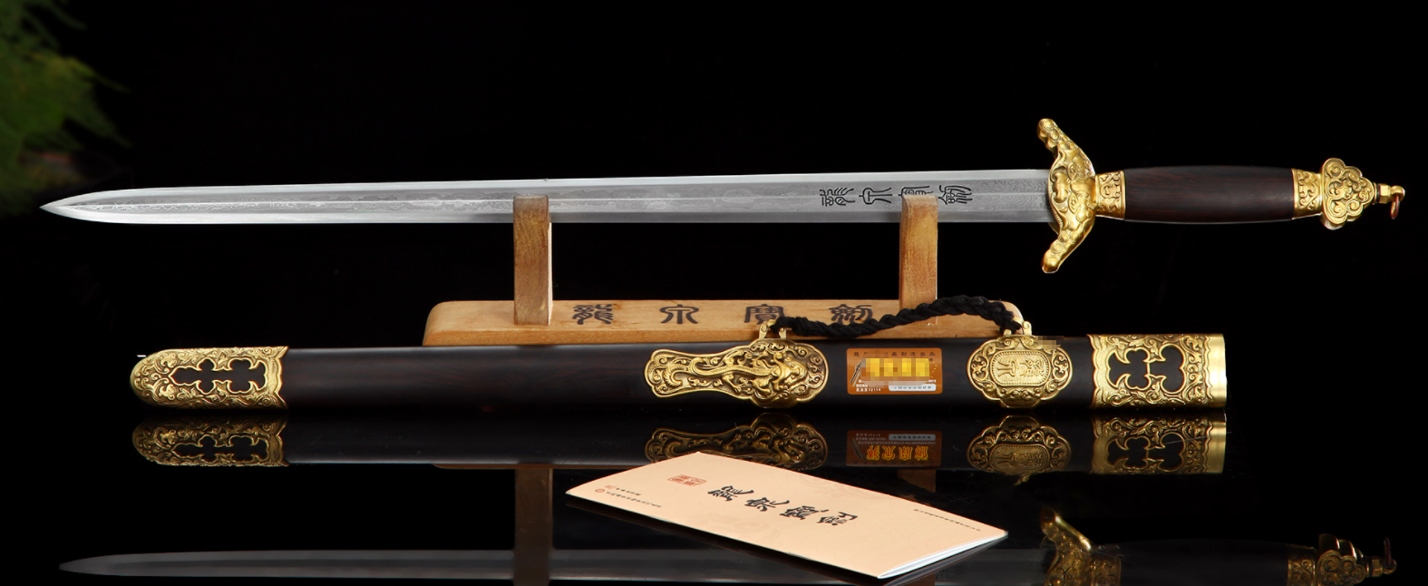 ·柄鞘·黑檀木:黑檀木是名贵的木材,质地坚硬,密度高,手感沉稳。用它制作的剑柄和剑鞘,不仅耐磨防潮,保护剑身,其细腻的质感和深邃的色泽,更赋予了整把剑一种文人雅士般的内敛与高贵。