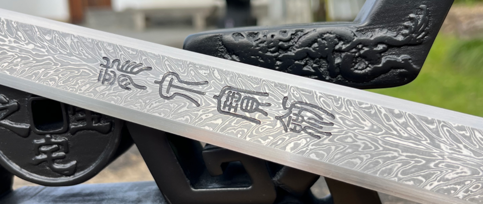 千层钢凤羽纹剑身:剑身采用经典的千层钢夹钢锻造工艺,经过无数次折叠锻打,锤炼出层次分明、细密如羽的“凤羽纹”。这不仅赋予了剑身良好的韧性与强度,更使其具有独特的艺术美感,每一道纹路都记录着火与铁的淬炼过程。