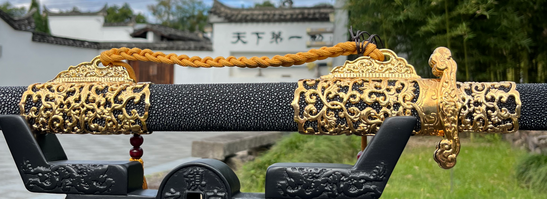 黄铜镀金装具:剑装(护手、剑柄头等)以优质黄铜为基,经镂空雕刻技艺精雕细琢,再施以镀金处理。图案纹饰古朴典雅,线条流畅,金光闪耀,与珍珠鱼皮鞘相得益彰,整体呈现出典雅华贵的气息。