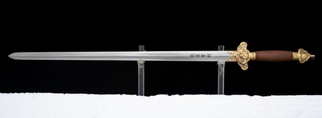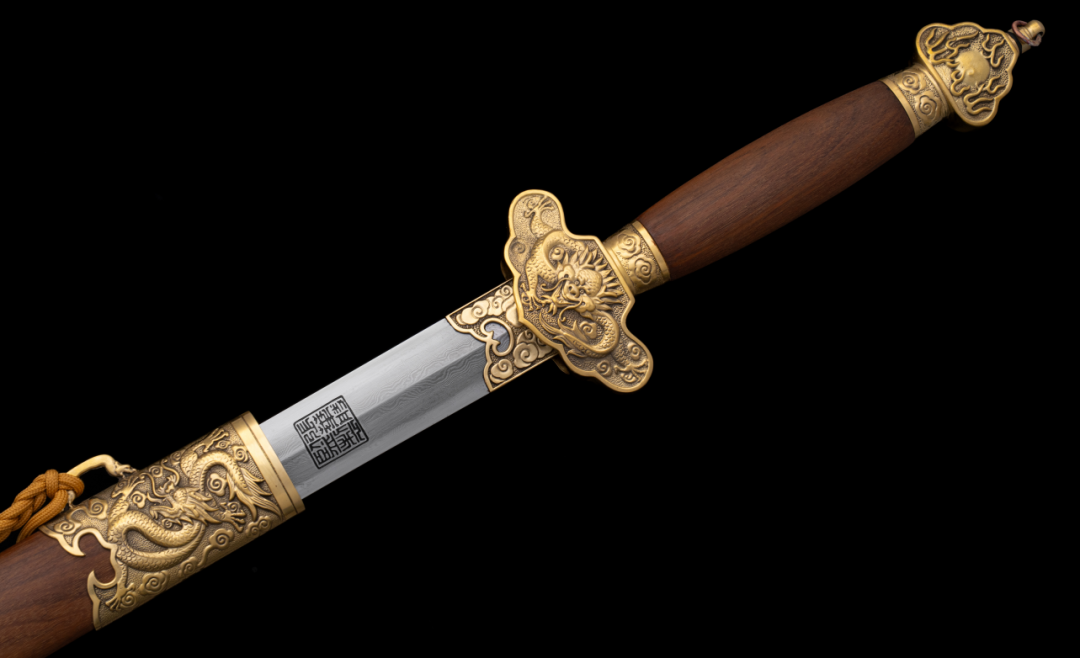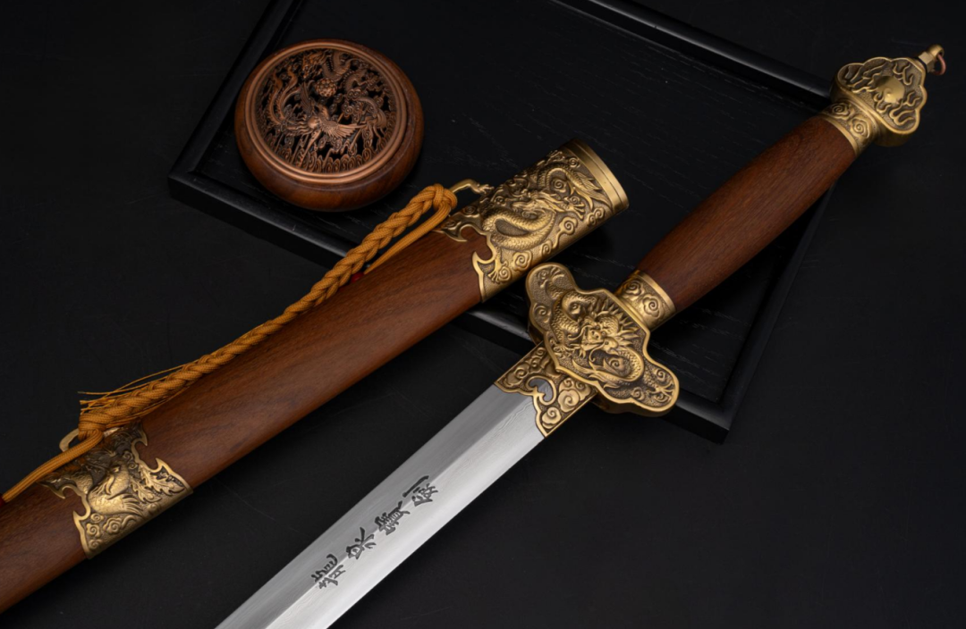 装具与剑鞘:剑鞘选用纹理华美的龙凤檀木,木质温润,手感沉实,不仅保护剑身,其本身就是一件精美的木艺品。黄铜装具经过精心铸造与雕琢,龙凤纹样栩栩如生,线条流畅。宝塔形的剑首与元宝状的剑格,设计古朴,为整剑增添了庄重之感。