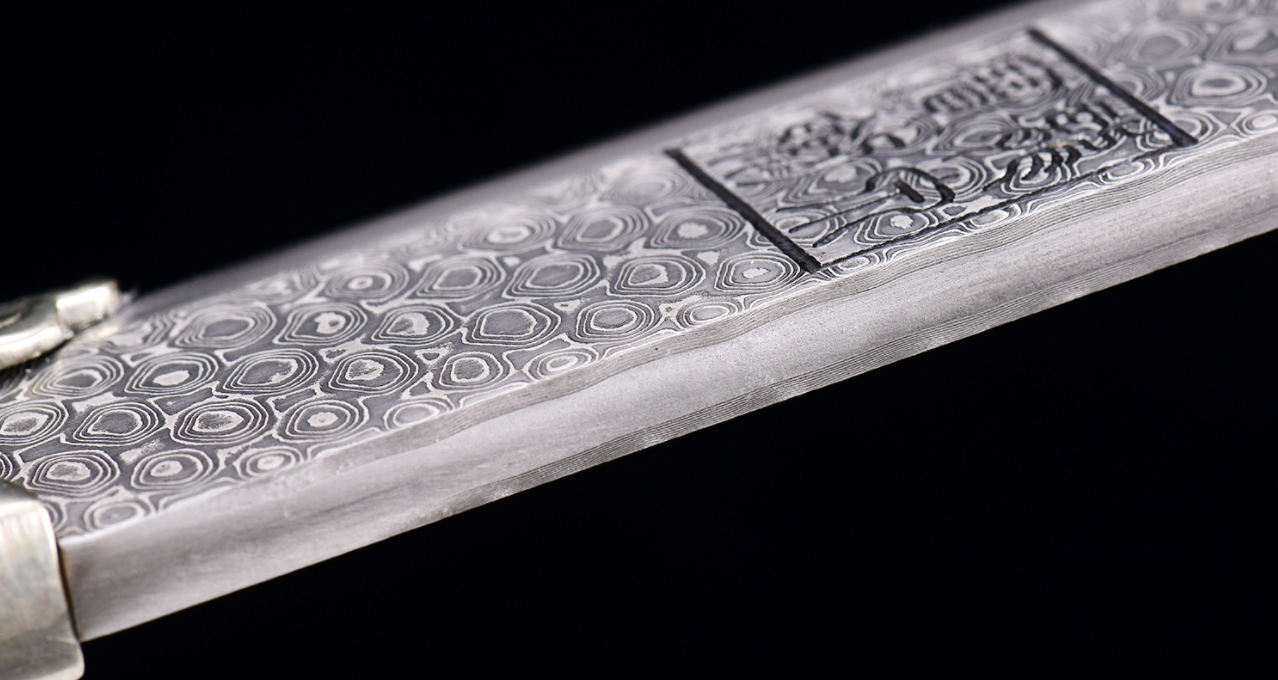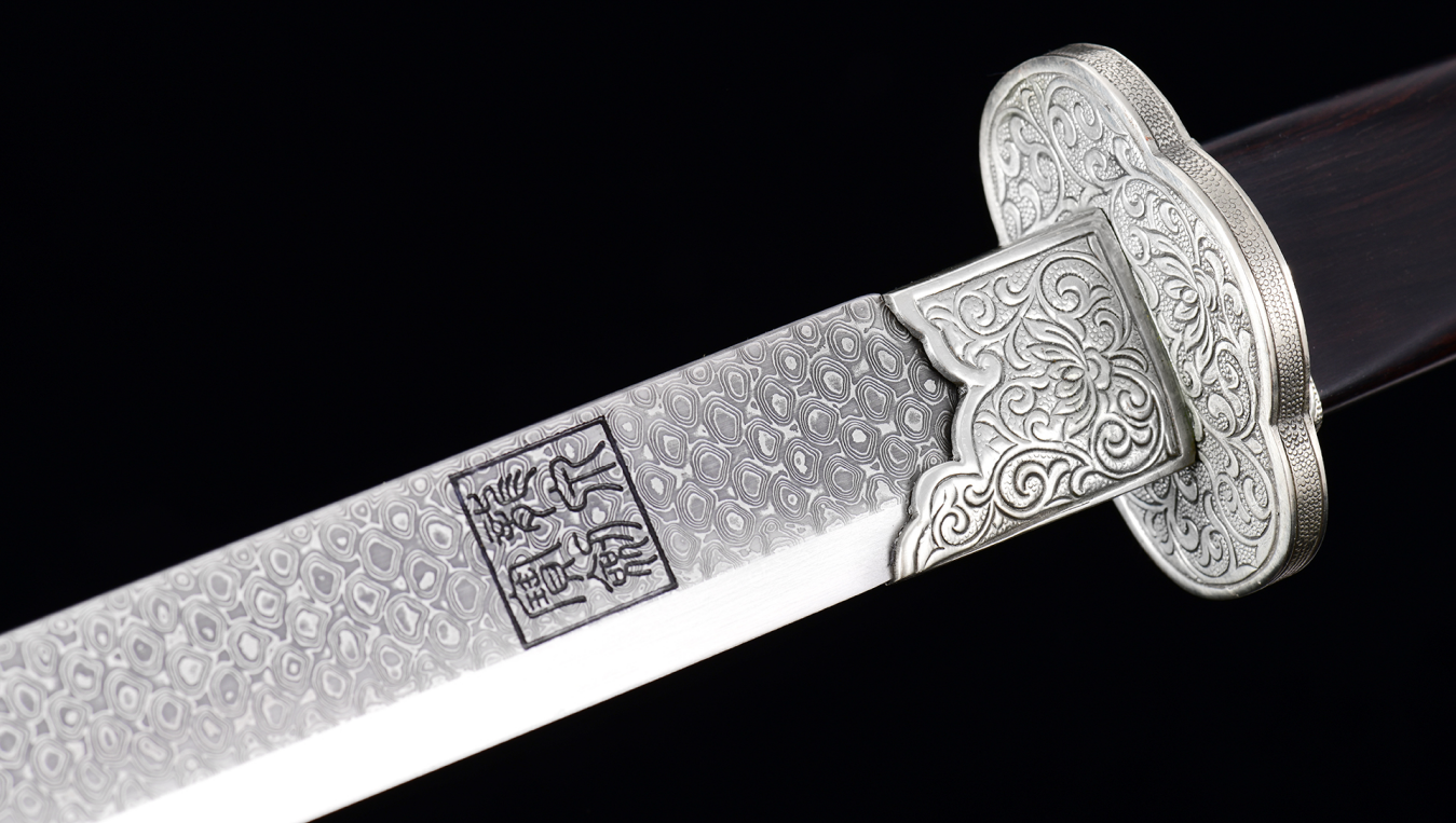 这种工艺一方面保证了刀身的韧性与强度,另一方面在钢材表面自然形成了类似龙鳞的纹路。刀身经过手工研磨,并刻有“龙泉宝剑”印章,是龙泉宝剑非物质文化遗产传承的体现。
