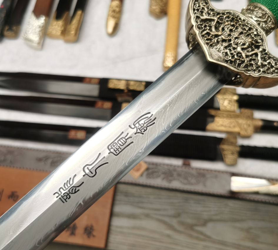 剑身是整把剑的灵魂所在。其选用优质精钢特殊配比的百炼花纹钢锻造,兼顾韧性与硬度。剑身呈四面形制,采用璇焊羽毛纹锻打工艺,纹理清晰如羽毛状。再经古法覆土烧刃与细致的手工研磨,剑身光亮,烧刃纹路明显。这一系列工序,充分展现了龙泉宝剑锻造技艺的深厚底蕴,也体现了非物质文化遗产的独特魅力。