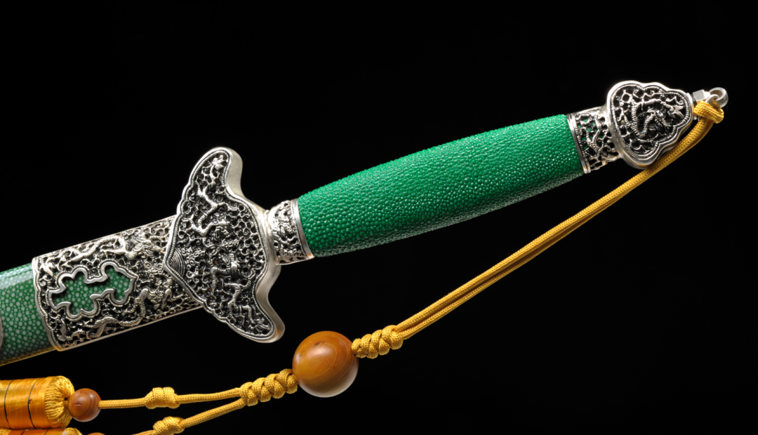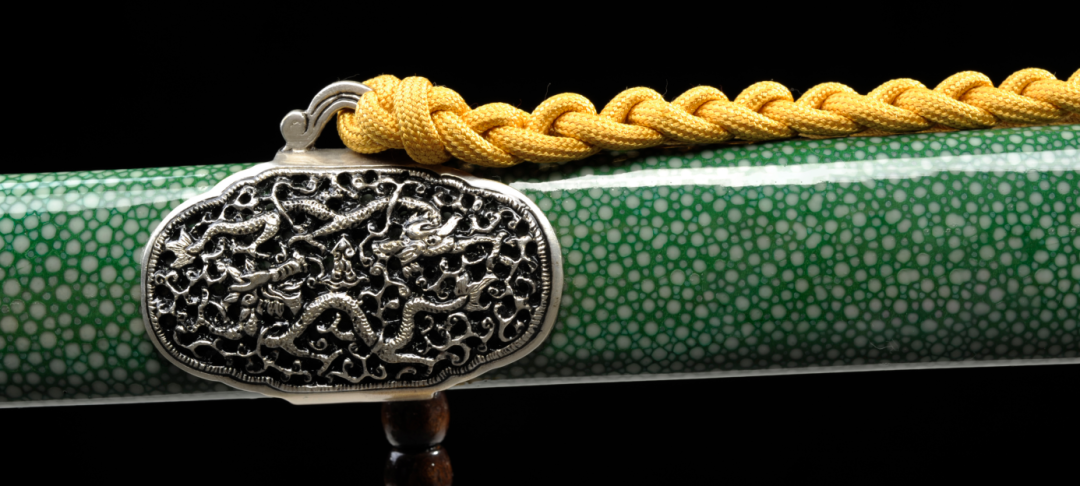 《龙玄剑》遵循清剑形制,全长一米有余。剑装采用黄铜镂空雕刻龙纹,并施以镀银工艺,使得龙纹立体且光泽含蓄。剑鞘选用优质珍珠鱼皮,经打磨罩漆后,呈现出独特的绿色底色与遍布的白色珠粒感;表层漆艺处理更使其外观莹润光亮,颇具观赏性。