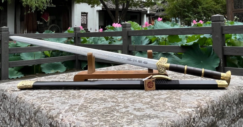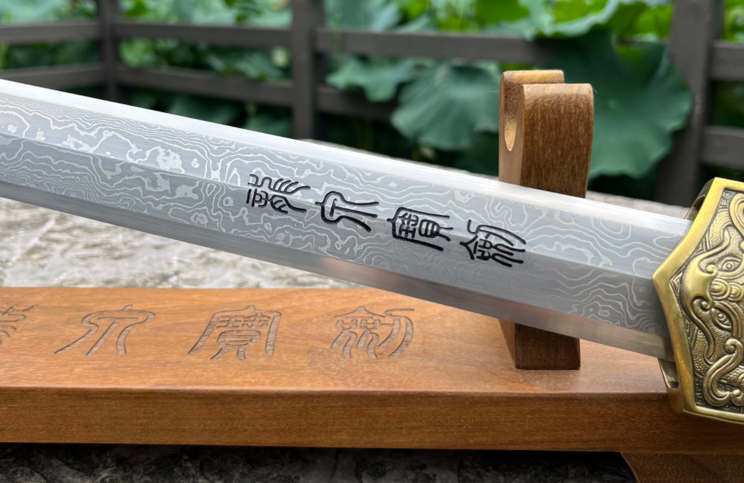 剑身采用古法千层钢锻造,经过千次锤炼与淬火,呈现出令人赞叹的纹理与坚韧韧性,锋锐耐用,特殊的材料工艺,还让宝剑具备了极好的耐锈耐腐特性,柄鞘精选高品质黑檀木,细腻温润,色泽深邃,手感**,彰显尊贵与雅致。御天汉剑的装具采用金银雕花工艺,结合传统繁复的纹饰设计,既展现皇室威仪,又寓意吉祥如意。