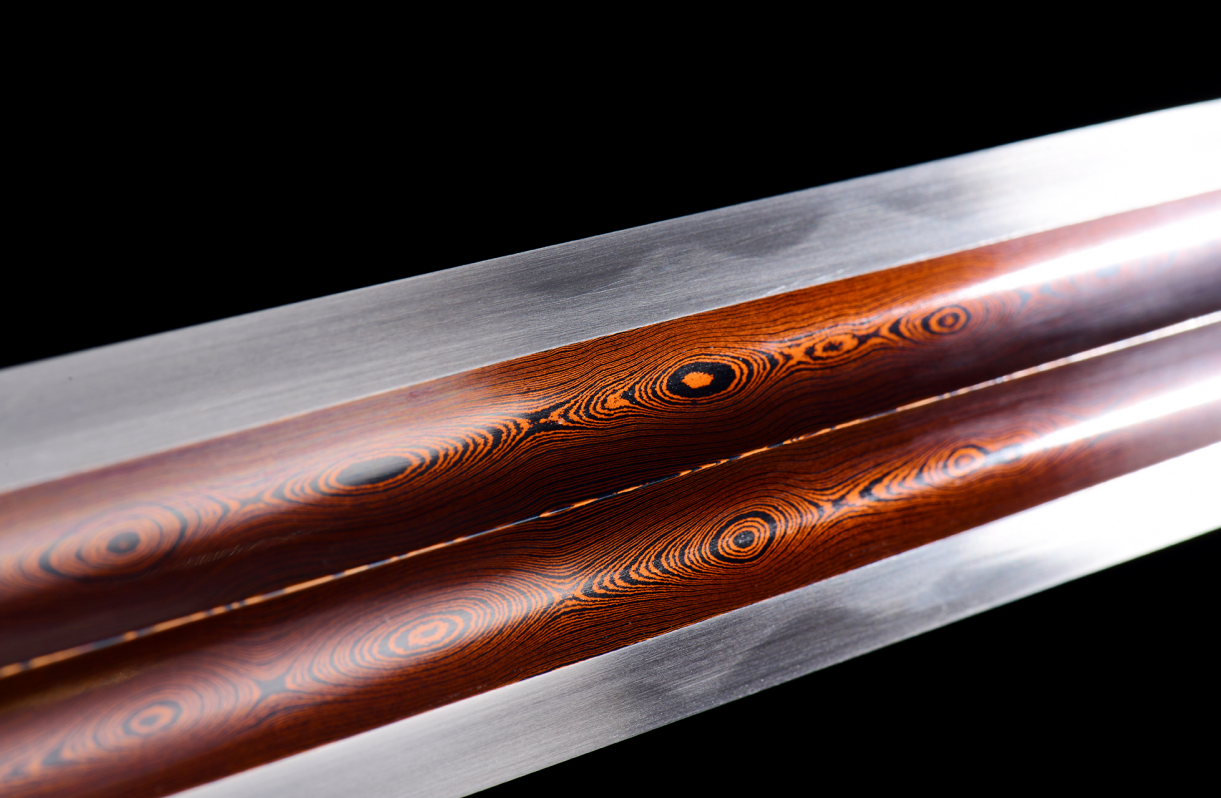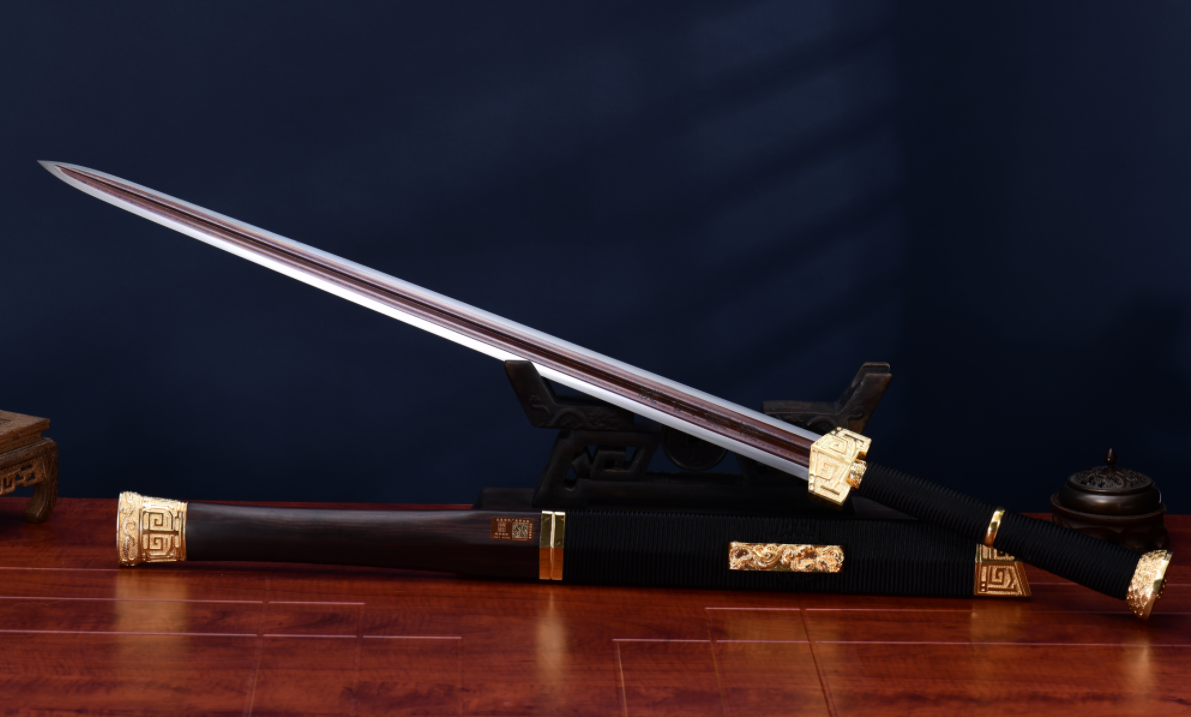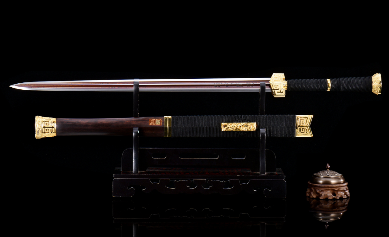 龙泉宝剑厂创作的《大汉剑》,正是以赤霄剑为精神蓝本,将历史传说凝练于钢铁之中。其剑身采用古法"毛铁百炼钢"反复折叠锻打,去除杂质,形成致密坚韧的钢体。这种源自汉代的"百炼钢"工艺,使剑身呈现神秘随机的钢材纹理。这把大汉剑,既承袭了秦汉剑器"平直端正"的造型,更暗合儒家"外圆内方"的哲学——剑鞘圆润温厚,出鞘则锋芒毕露。装具选用简约黄铜镀金,摒弃繁复雕饰而显帝王威仪;黑檀木剑鞘纹理细密如墨玉,与金铜装具形成庄重对比,恰似斩蛇传说中黑夜与赤光的意象交织。
