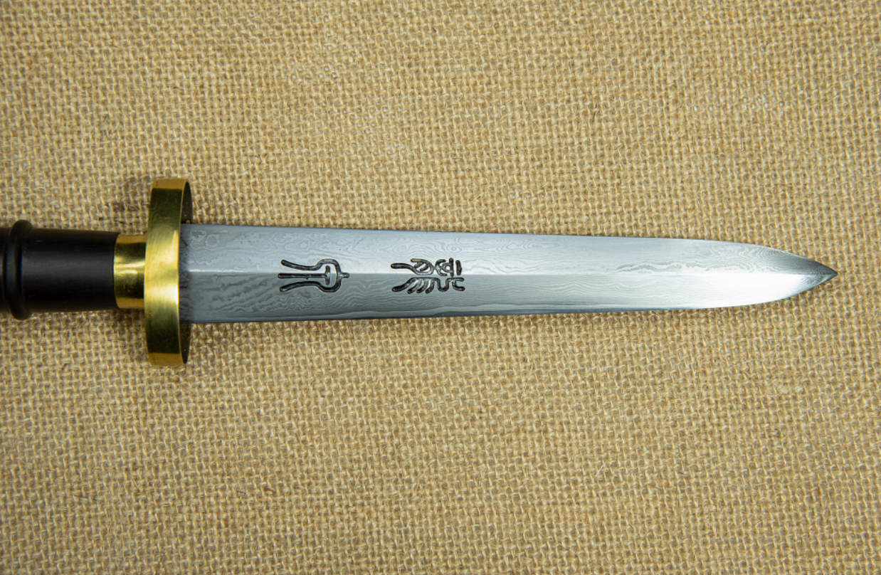 龙泉宝剑厂承袭千年龙泉宝剑锻造技艺,根据这一传奇故事设计打造了一把小巧的鱼肠短剑,剑身采用千层钢夹钢工艺——以高碳钢为刃芯,柔铁为脊,经反复折叠锻打,形成流水缠结般的细密纹理,既还原了古籍中"蟠钢剑文似鱼肠"的记载,又赋予剑体刚柔并济的特性。这种复合结构使剑身具备了坚韧锋锐的特性,可轻松斩断草席,同时兼具耐锈耐腐性能。剑身研磨需历经28道传统工序,在特产的亮石上手工磨砺数日,方成就摄人心魄的锋芒和凛冽寒光。